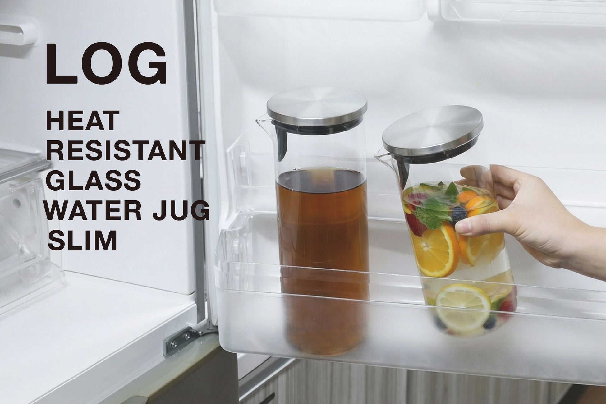 冷蔵庫ポケットに2本以上並ぶ、収納効率を考えた『LOG耐熱ガラスウォータージャグ スリム』