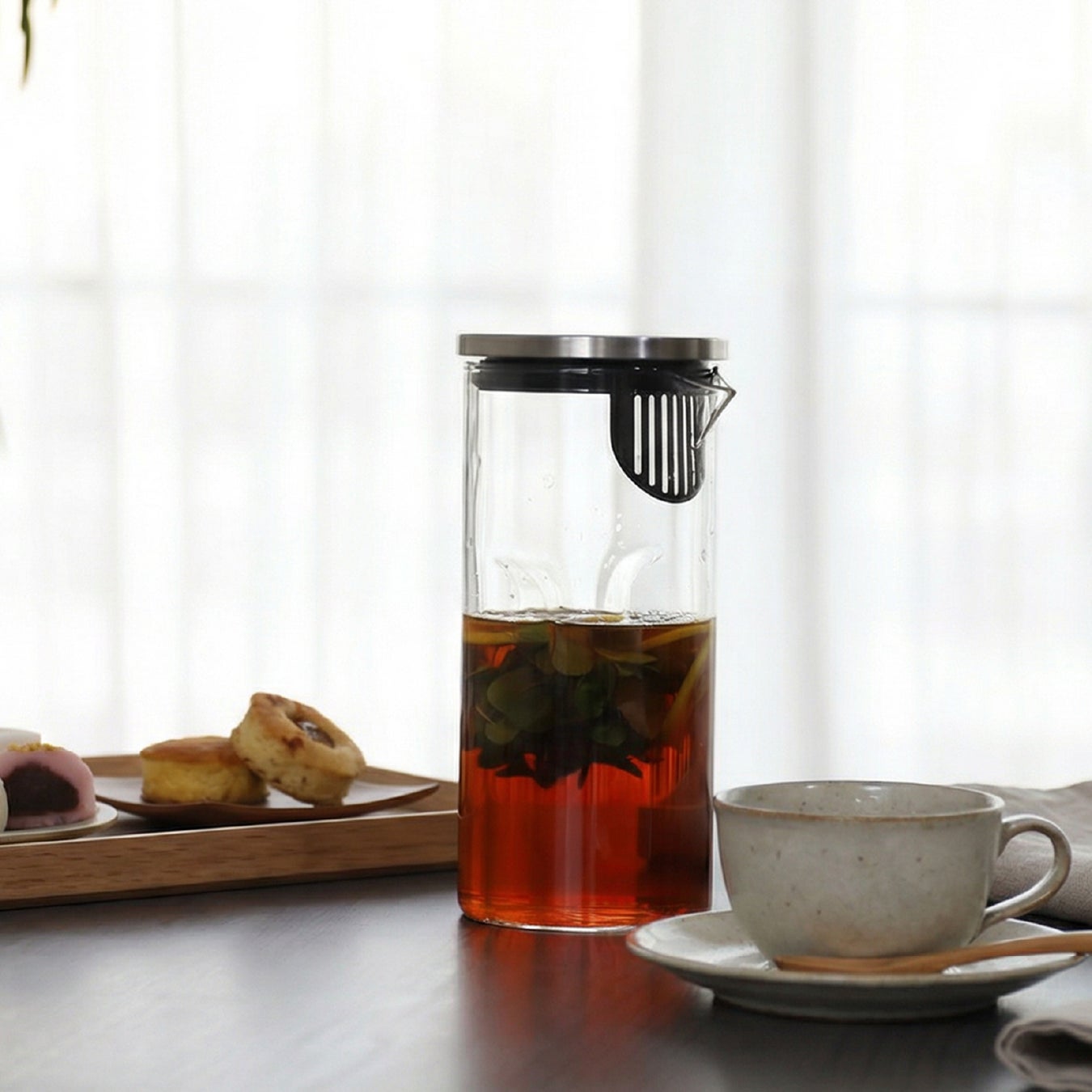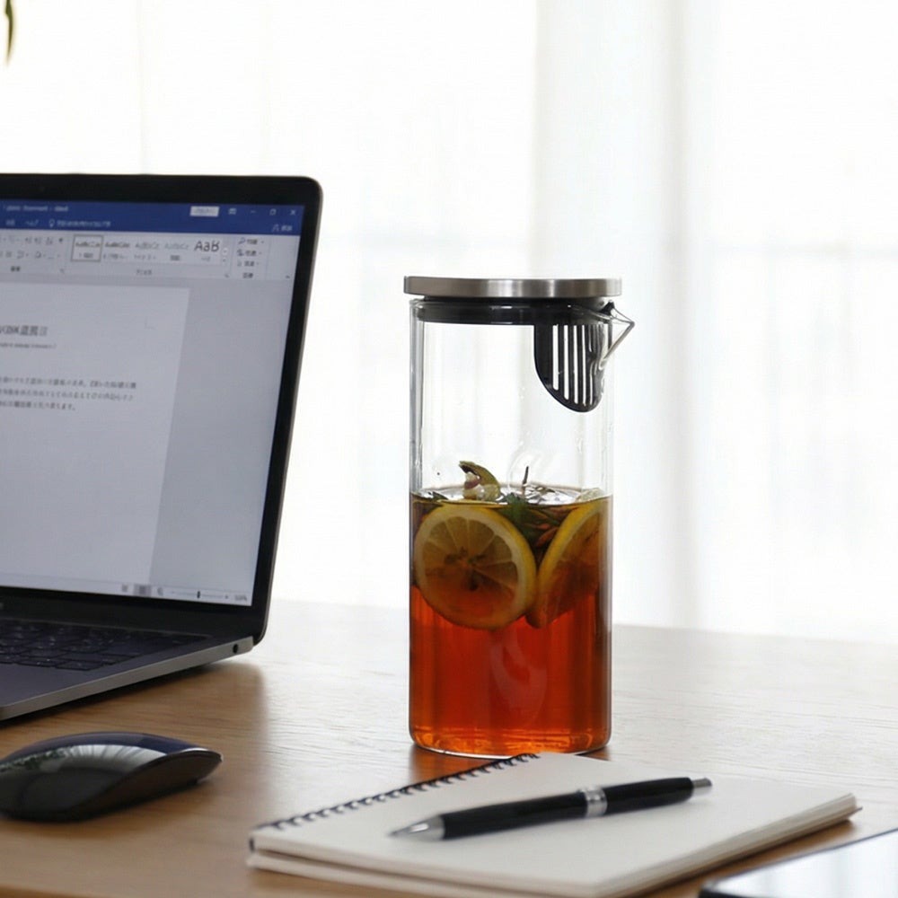 広口で洗いやすく、熱湯OK。麦茶ポットやフレーバーウォーターづくりに使えるフィルター付きで、冷蔵庫収納をすっきり整える。