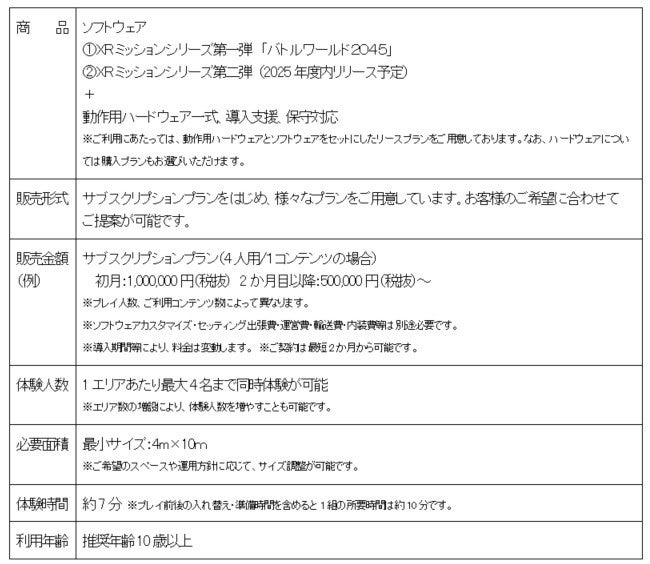 「XRミッションシリーズ」は、ヘッドマウントディスプレイを装着してプレイするフリーローミング(自由歩行型)のシューティングアトラクションです。パッケージ商品は、お客様のご予算やご要望に応じて選べる料金プランをご用意しており、初期費用を抑えてスムーズに導入いただけます。第一弾の「XRミッション バトルワールド2045」を皮切りに、入れ替え可能なコンテンツを今後も様々なジャンルで開発し、ラインナップを拡充していく予定です。