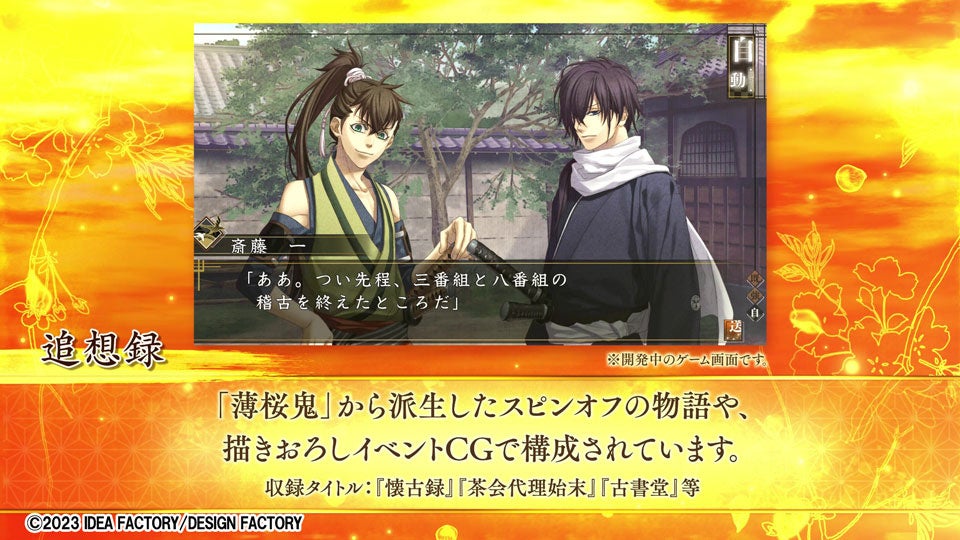 今作は『薄桜鬼 随想録』から『薄桜鬼 真改』へと組み込まれなかった日常物語や追加物語、そして他コンテンツにて製作された『薄桜鬼』のスピンオフ物語の数々をひとつにまとめ、再びファンの皆様にお届けするファンディスクです。