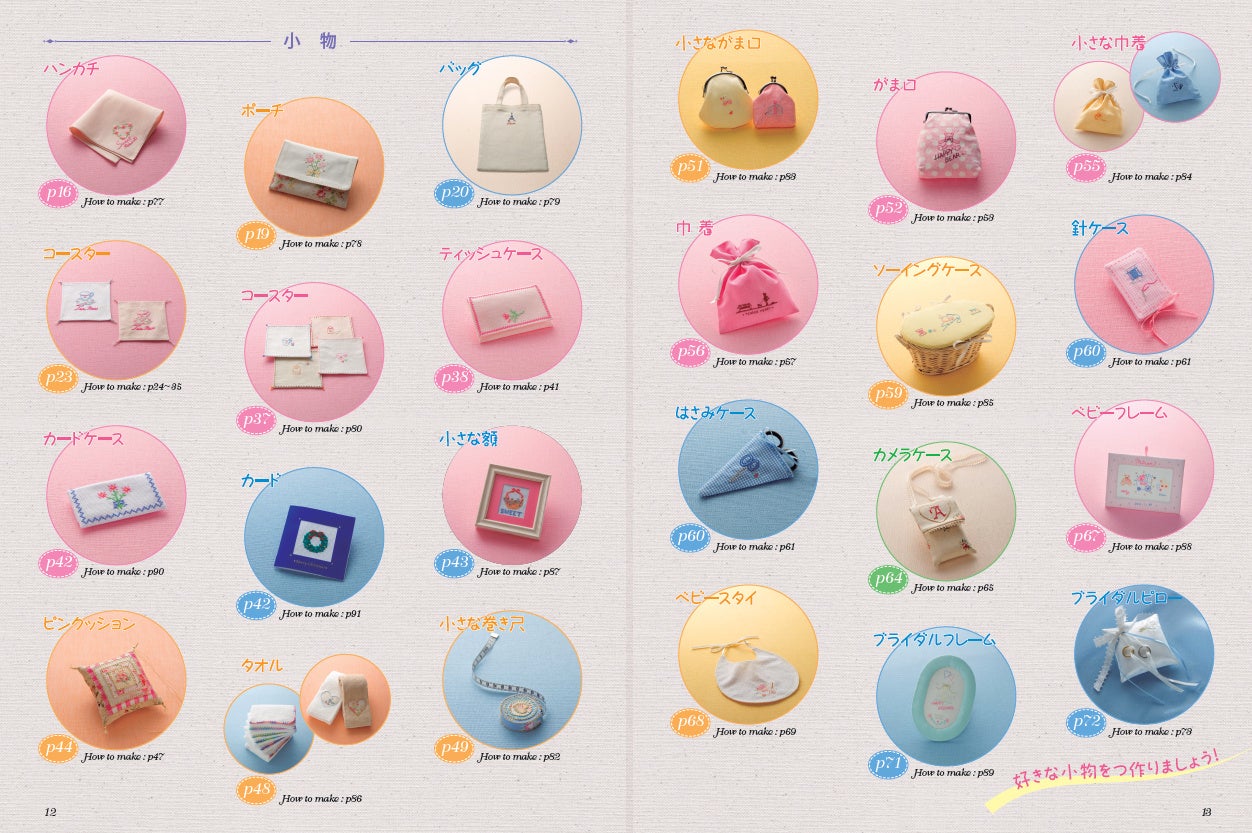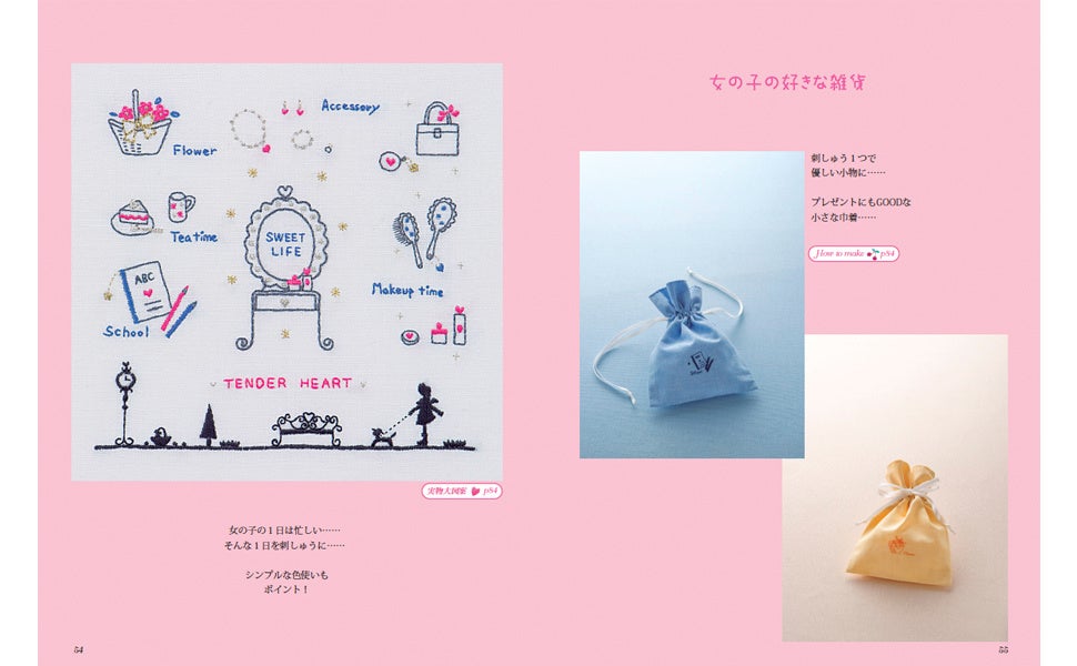 がんばって刺しゅうしたものはコースターやポーチ、巾着やがま口などの小物に手縫いで仕立てます。大人でも子どもでも使える雑貨やお花、動物などをモチーフにした図案はもちろんのこと、アルファベットやブライダル・ベビーなど贈り物に最適なものまで満載。