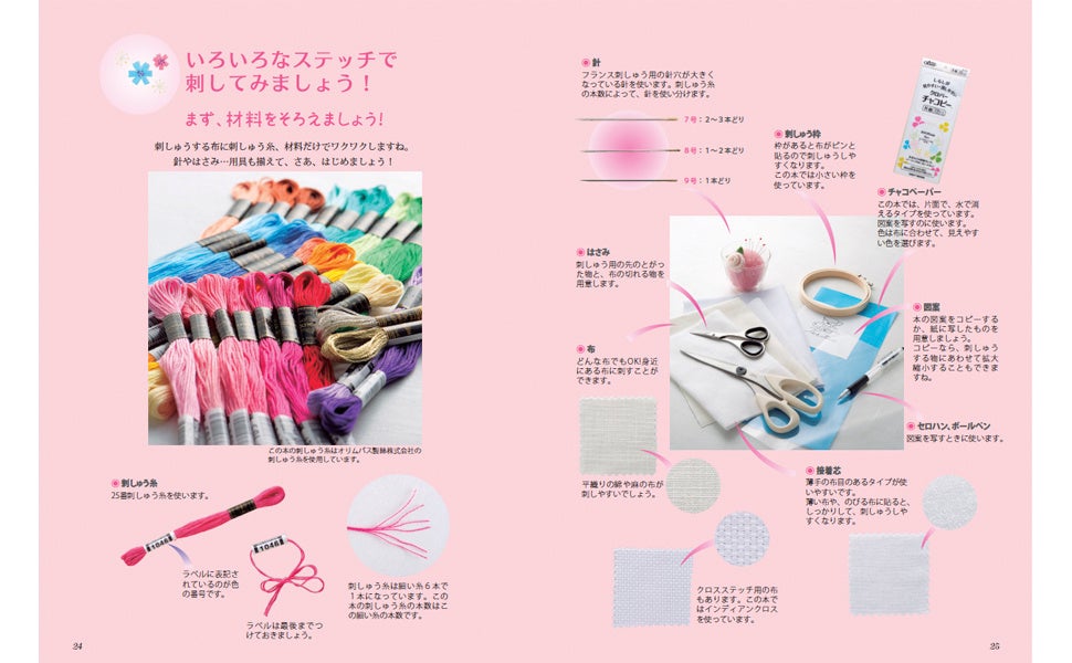 必要な材料や道具はもちろん、刺しゅう糸のラベルの見方から取り出し方、針への通し方、