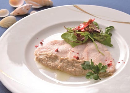 低温調理でしっとり柔らかく仕上げた鶏はツナ、ケッパー、レモンを合わせたトンナートソースでお召し上がりください