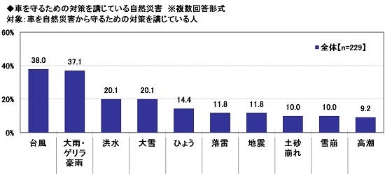 車を自然災害から守るための対策を講じている方229名に、車を守るための対策を講じている自然災害を聞いたところ、「台風」(38.0%)が最も多くなり、「大雨・ゲリラ豪雨」(37.1%)、「洪水」「大雪」(いずれも20.1%)、「ひょう」(14.4%)が続きました。