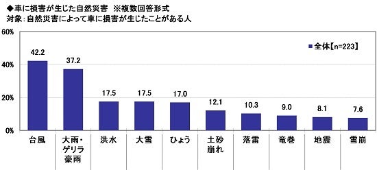 自然災害によって車に損害が生じたことがある方223名に、車に損害が生じた自然災害を聞いたところ、「台風」(42.2%)が最も多くなり、「大雨・ゲリラ豪雨」(37.2%)、「洪水」「大雪」(いずれも17.5%)、「ひょう」(17.0%)が続きました。