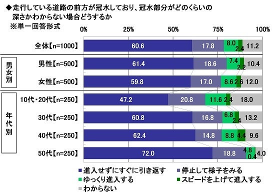 全回答者1,000名に、走行している道路の前方が冠水しており、冠水部分がどのくらいの深さかわからない場合どうするかを聞いたところ、「進入せずにすぐに引き返す」(60.6%)が最も多くなり、「停止して様子をみる」(17.8%)、「ゆっくり進入する」(8.0%)、「スピードを上げて進入する」(2.4%)が続きました。また、「わからない」は11.2%でした。