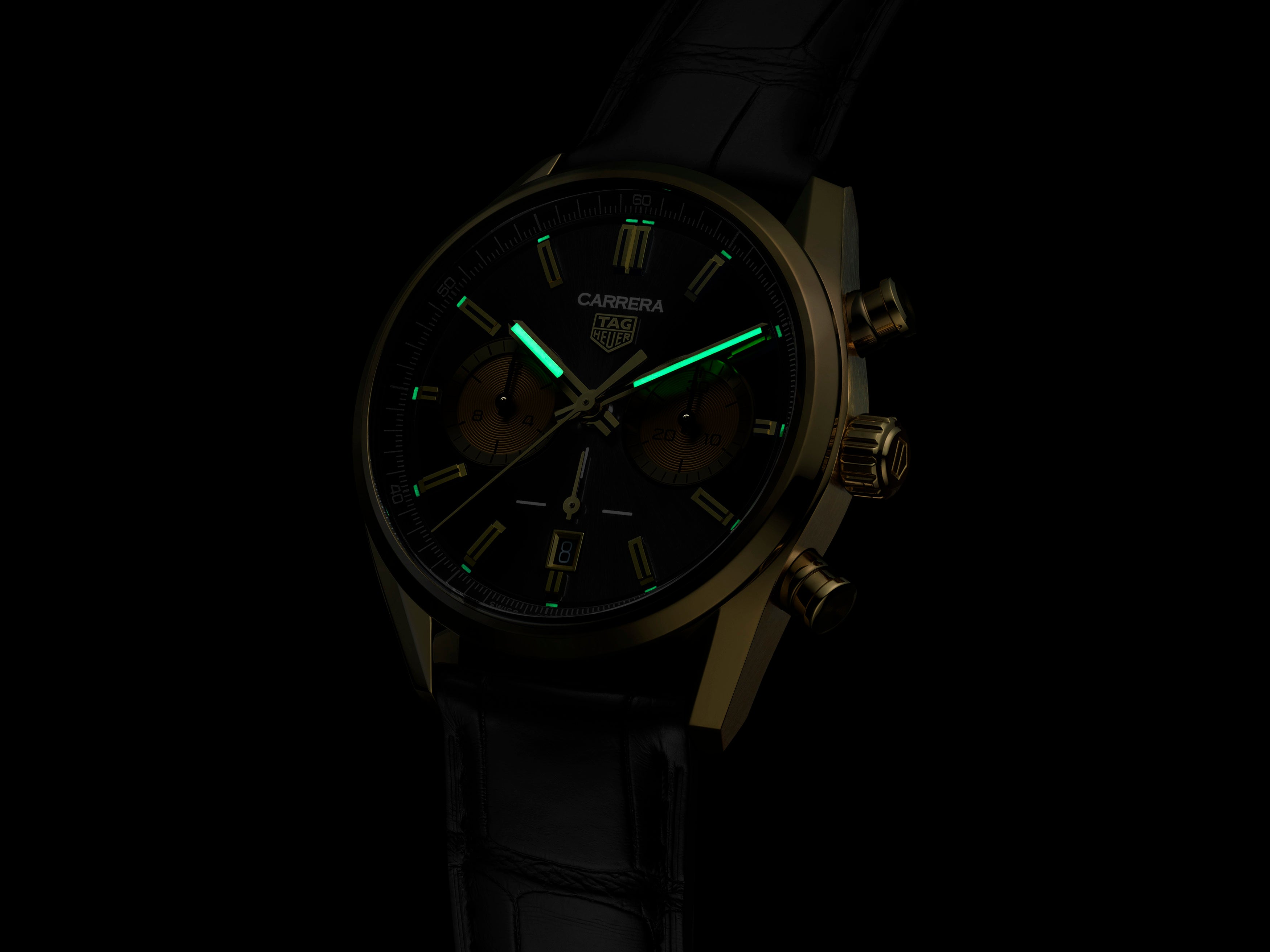 タグ・ホイヤーは、このユニークなレガシーをさらに発展させ、ブラックダイヤルにゴールドプレートのサブダイヤルを配したこれまでにないデザインに仕上げました。これは有名なRef.1158CHNのダイヤルカラーを反転させたものです。また、1970年代から80年代にかけて活躍したF1マシンであるブラック × ゴールドの伝説的なジョン・プレイヤー・スペシャル カラーも、愛好家にはお馴染みかもしれません。タグ・ホイヤーのアンバサダーであり世界チャンピオンのアイルトン・セナが操縦した、ロータス98Tも輝かしい戦歴の初期の頃にこの世界的に有名なカラーリングをマシンのボディに纏っていました。