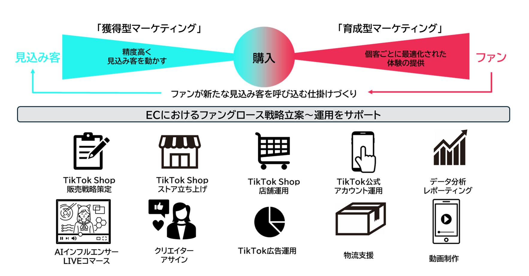 日本市場でのTikTok Shop正式導入を受けて、ADK MSでは販売戦略の策定からコンテンツ制作、ショップ運営までの⼀連の業務を⼀気通貫で⽀援いたします。加えて、ADKグループのADKエモーションズもセラー(出店者)としてTikTok Shopに参加することで、現場で得たリアルな知見やデータに基づく、実践的かつ成果直結型の支援も可能となります。