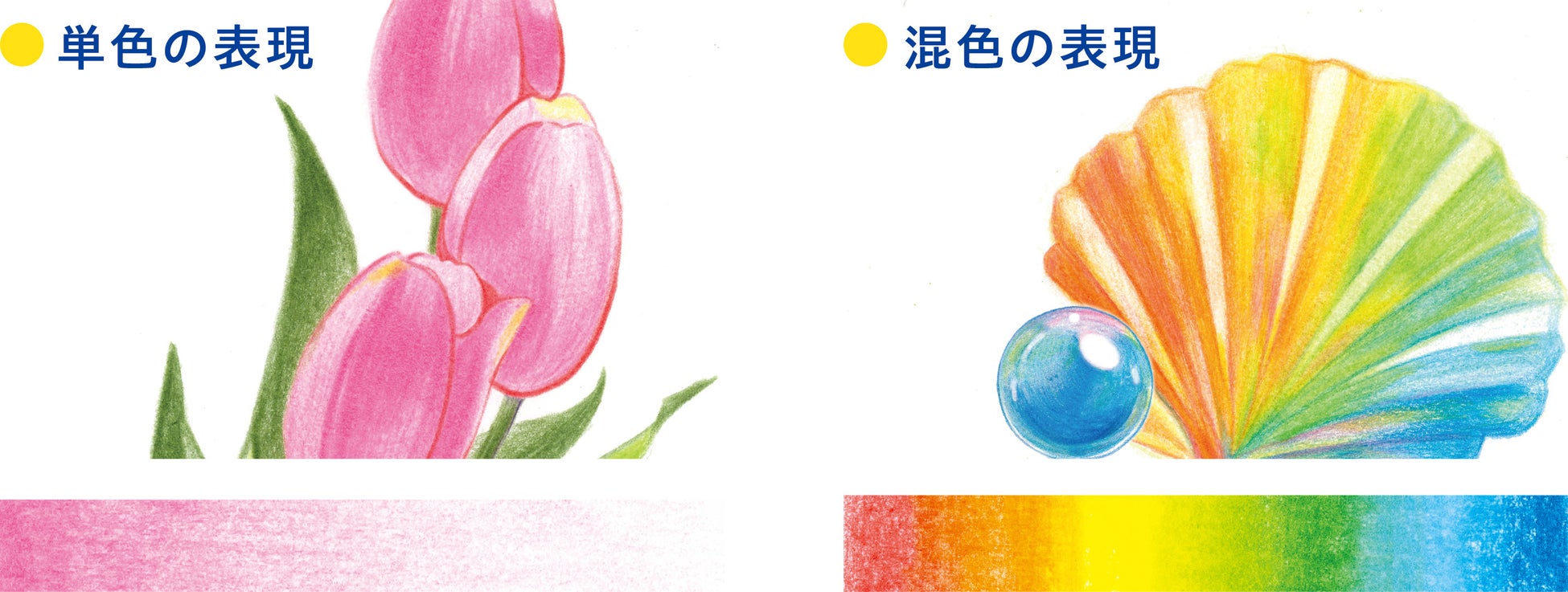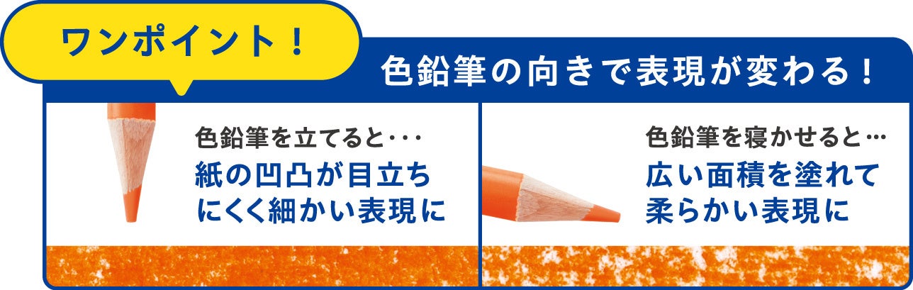 発色の良さが特長の色鉛筆で、色を重ねたり混ぜたりすることで、深みのある表現ができます。さらに、色鉛筆を立てると紙の凹凸が目立ちにくく細かい表現に、色鉛筆を寝かせると広い面積を塗れて柔らかい表現になるなど、色鉛筆の向きによって雰囲気が変えられます。鉛筆の形状は子どもが握りやすい丸軸を採用しました。