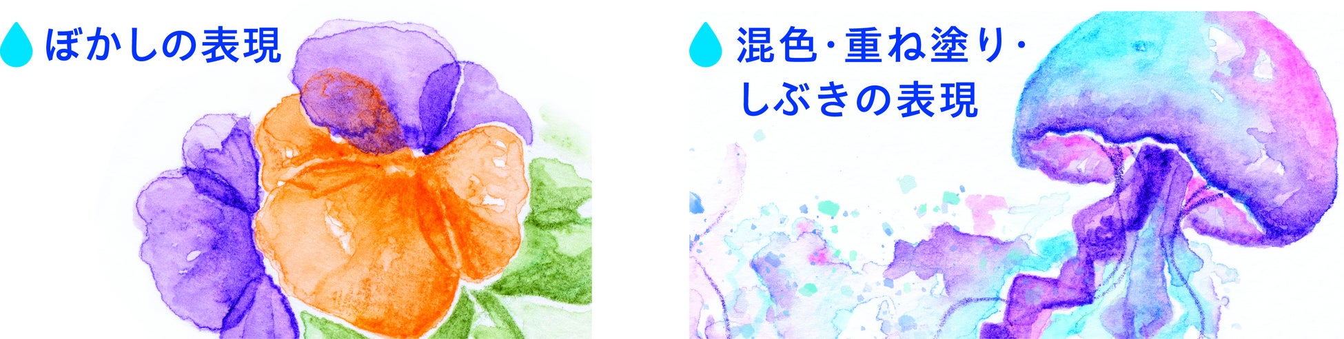 水彩色鉛筆は、水で溶かすと水彩画のようなタッチで、「ぼかし」「混色・重ね塗り」「しぶき(スパッタリング)」などさまざまな表現が得られます。鉛筆の形状は持ちやすさを重視し、転がりにくい六角形状の軸を採用しました。