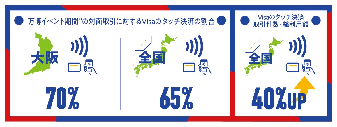 万博開催地・大阪では、対面取引件数の約70%がタッチ決済となり*6、全国平均(65%*6)を上回る結果となりました。また、タッチ決済による消費額を見ると、前年比で、京都では50%*1、兵庫でも55%*1と大幅に増加したことがわかりました。タッチ決済による取引件数および消費額において、全国平均の40%*1の増加を上回る結果となっています。