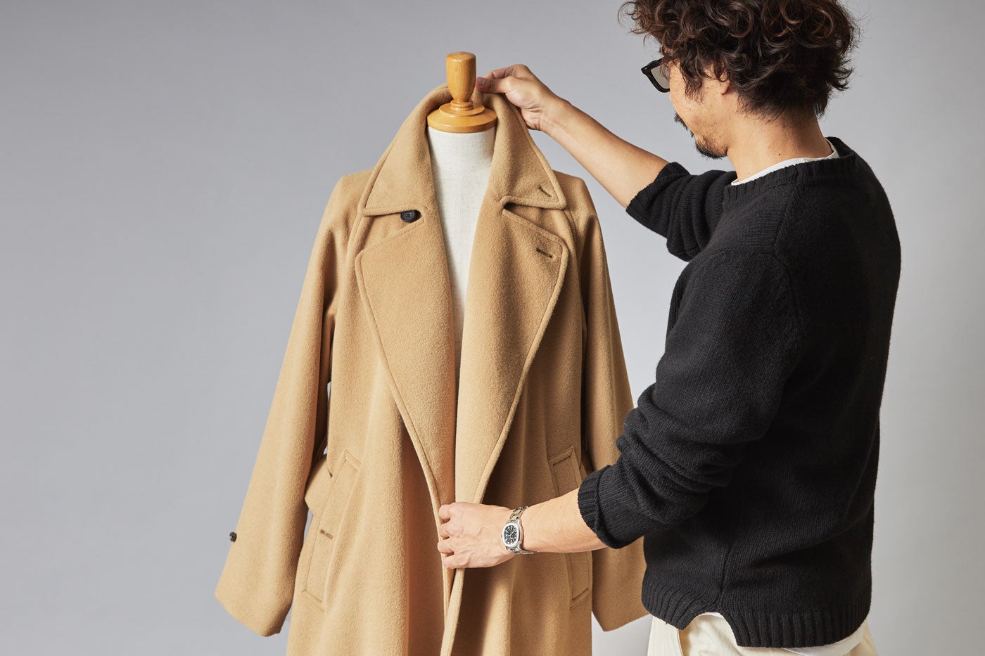 「何を隠そう、僕は大のキャメルコート好きでして、このアンゴラウールはぜひともキャメルカラーで展開したいと思いました。冬のコートといえばネイビーやグレーなどダークトーンが定番ですが、それらはシックさが魅力的な一方、コーディネートが重たい印象になりがち。ですがお洒落な人は、冬こそ軽快感を大切にしています。そこで重宝するのがキャメルカラーコート。明るい色みで軽やかさを演出でき、かつ派手に見えないところが使いやすさの理由です。ベージュと同じ感覚で合わせられるので、実は着こなしもカンタンなんです。一着ワードローブに揃えておくと、着こなしの幅が断然広がるはずですよ」 (四方さん)
