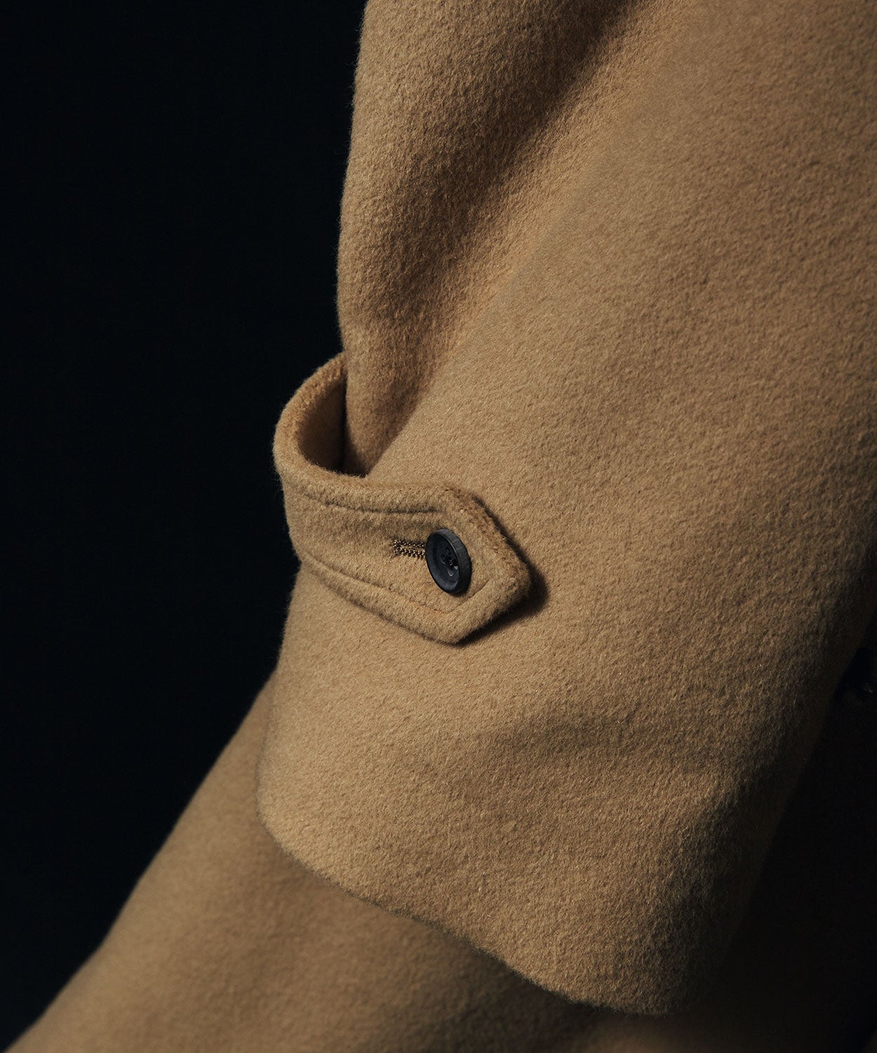 四方さんがこだわったのが、“着込む”というより“羽織る”感覚で使える軽快さ。その実現のため、胸周りの芯地を省いて柔らかに仕立てています。たっぷりしたAラインシルエットはヴィンテージの雰囲気を踏襲しつつ、首周りはコンパクトに設計することでモダンなリラックスシルエットに仕上げました。腰ベルトの位置をやや上寄りに設定したり、ベルトのバックルを排してラップコートのような柔和さを意識したりと、ディテールにも細かなアレンジを施しています。