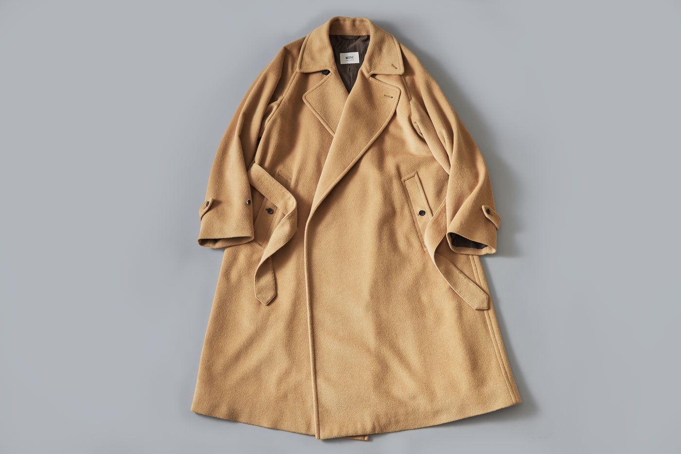 「これまでのコットンギャバジンも上質さにこだわって素材選定をしていたのですが、このアンゴラウールにも一目惚れしました。とにかく手触りが心地よく、贅沢感が半端じゃない。素材情報を聞かずに触ると、“これってカシミヤ?”と思ってしまうほどです。たっぷりとしたシルエット、柔らかなドレープ感を特徴とする『ヨークシャー』とのマッチングは最高の一言で、ベルトを結んでキリッと着ても、外してサラリと着ても抜群に格好いい。コットンギャバジン版はどちらかというとトラディショナルな表情ですが、アンゴラウール版はノーブルなエレガンスが魅力だと思いますね」 (四方さん)