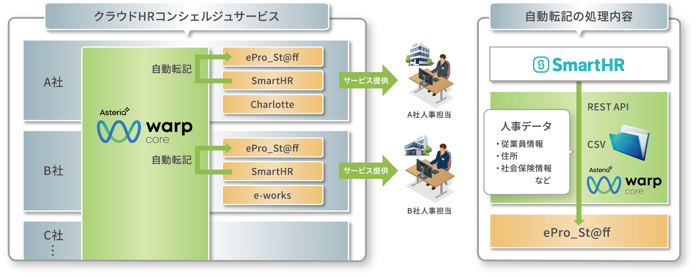 この課題を解決するためにJRQSSは、アステリアのデータ連携ツールCoreに着目。データ連携基盤をノーコードで容易に構築できること、予め装備されている100以上のアダプターやテンプレートにより多種多様なシステム等との連携が可能で、SmartHRやePro_St@ffとの連携実績が豊富なことから採用を決定しました。
