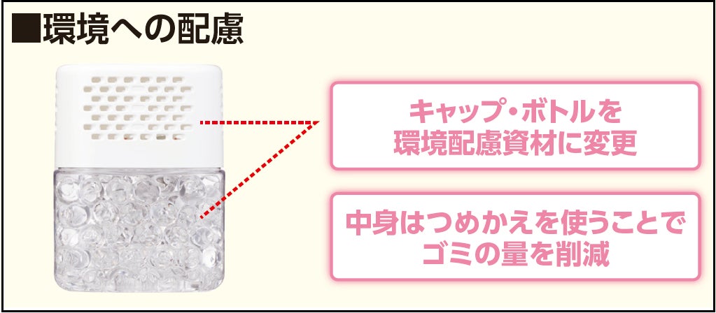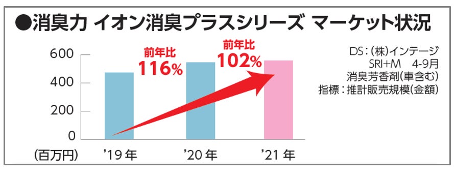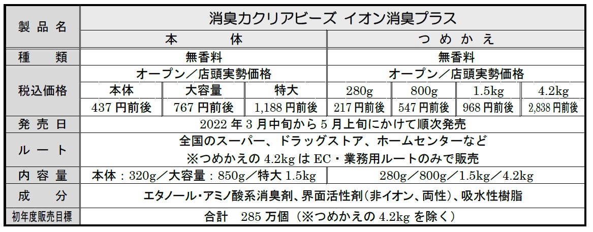 「消臭力 クリアビーズ イオン消臭プラス」は、これまで2019年から20年にかけて116%、20年から21年には102%と伸長し、マーケットを牽引して生活者から支持されてきました。新処方によって消臭効果をアップし、環境に配慮した素材の採用や「つめかえ」の使用を促進していくことにより、さらなる拡大と一層の市場活性化を目指します。