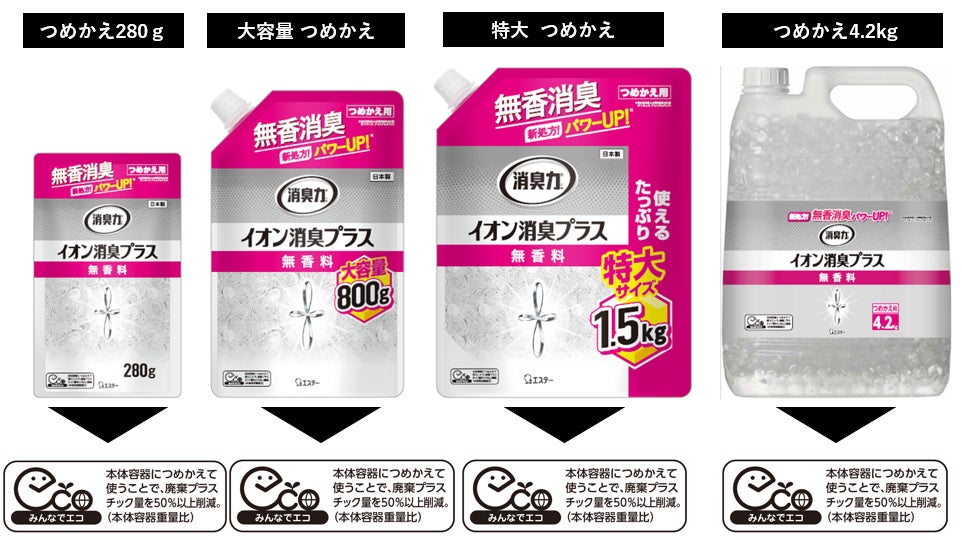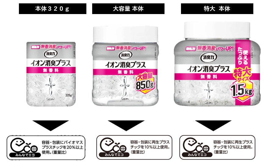 今回第一弾として発売する「消臭力クリアビーズ イオン消臭プラス」は、プラスチックのゴミの量を50%以上削減できる「つめかえ」の使用を促進し、「本体」はバイオマスプラスチック、「大容量 本体」と「特大 本体」は再生プラスチックを採用することで、環境に配慮した設計にしています。パッケージに各商品が達成している環境基準を“みんなでエコ”マークとともに表示します(図1)。