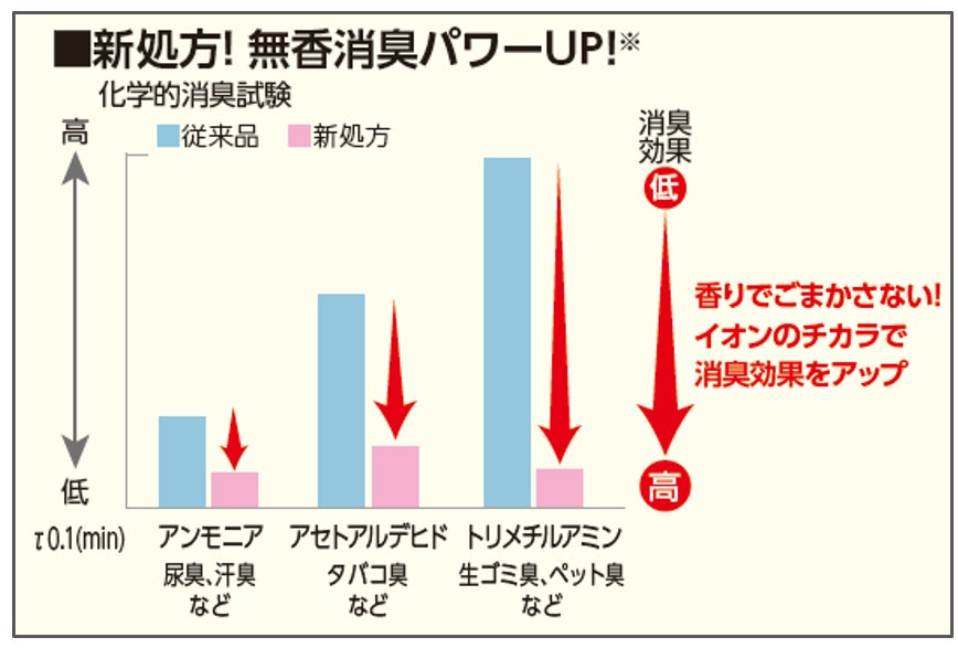 新しい「イオン消臭プラス」は、新処方により尿臭、汗臭などのアンモニア、タバコ臭などのアセトアルデヒド、生ゴミ臭やペット臭などのトリメチルアミンなどに対して、従来品よりも大幅に消臭効果をアップしました(※3)。