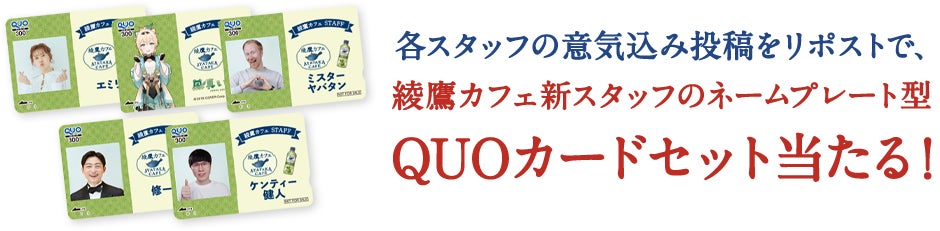 綾鷹公式X(旧Twitter)アカウントの対象のキャンペーン投稿リポストで、綾鷹カフェ 新スタッフのネームプレート型QUOカードがセットで当たるキャンペーンが開催中です。