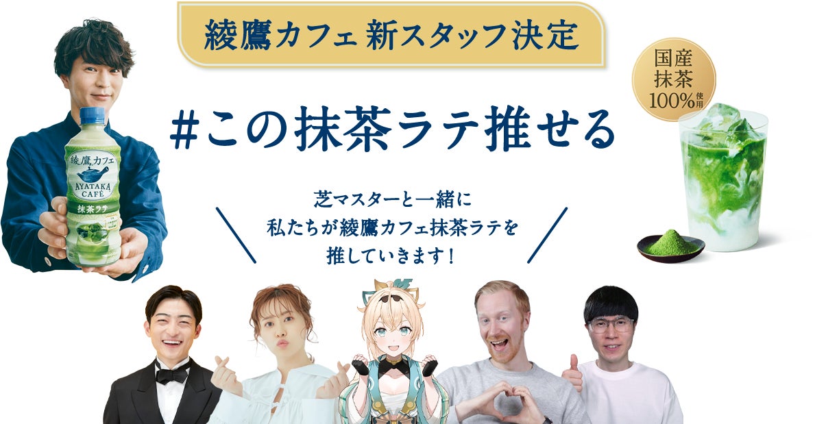 新スタッフの風真いろはさん、エミリンさん、ケンティー健人(PPP STUDIO所属)さん、ミスターヤバタンさんと綾鷹カフェ 抹茶ラテを推していきます。