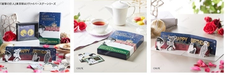 また、「記念メダルセット」は、ゴールド仕様の東京駅丸の内駅舎を背景に「リヴァイ」が描かれた特別感のあるデザインのメダルが「ハッピーバースデー」と書かれた台紙に収まるコレクション性の高い数量限定(300個)、シリアルナンバー入りの商品です。他にも、カードを開くと「リヴァイ」や東京駅丸の内駅舎が立体的に立ち上がる「グリーティングカード」も販売します。