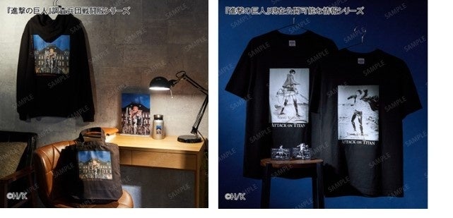 他にも別冊少年マガジンの表紙の貴重な原画を使用した東京駅丸の内駅舎を背景にした「スマホ自撮り」シリーズ、夜の東京駅丸の内駅舎を背景に「ミカサ」たちがクールにポージングを決める「調査兵団戦闘服」シリーズ、原作コミックスに掲載されていた機密情報ページのデザインを商品化した「現在公開可能な情報」シリーズなど、豊富なラインアップを展開します。