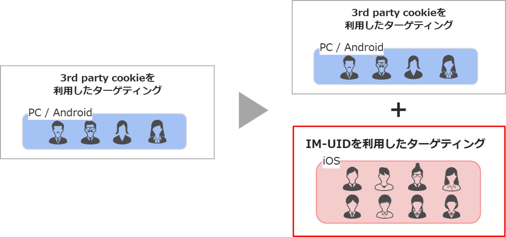 今回、新たに「ダイナミッククリエイティブ」へ「IM-UID」を導入したことにより、幅広いユーザーに対し、ユーザーごとにパーソナライズされたバナー広告の配信が可能となり、さらなるリーチ拡大、広告効果の向上が期待できます。