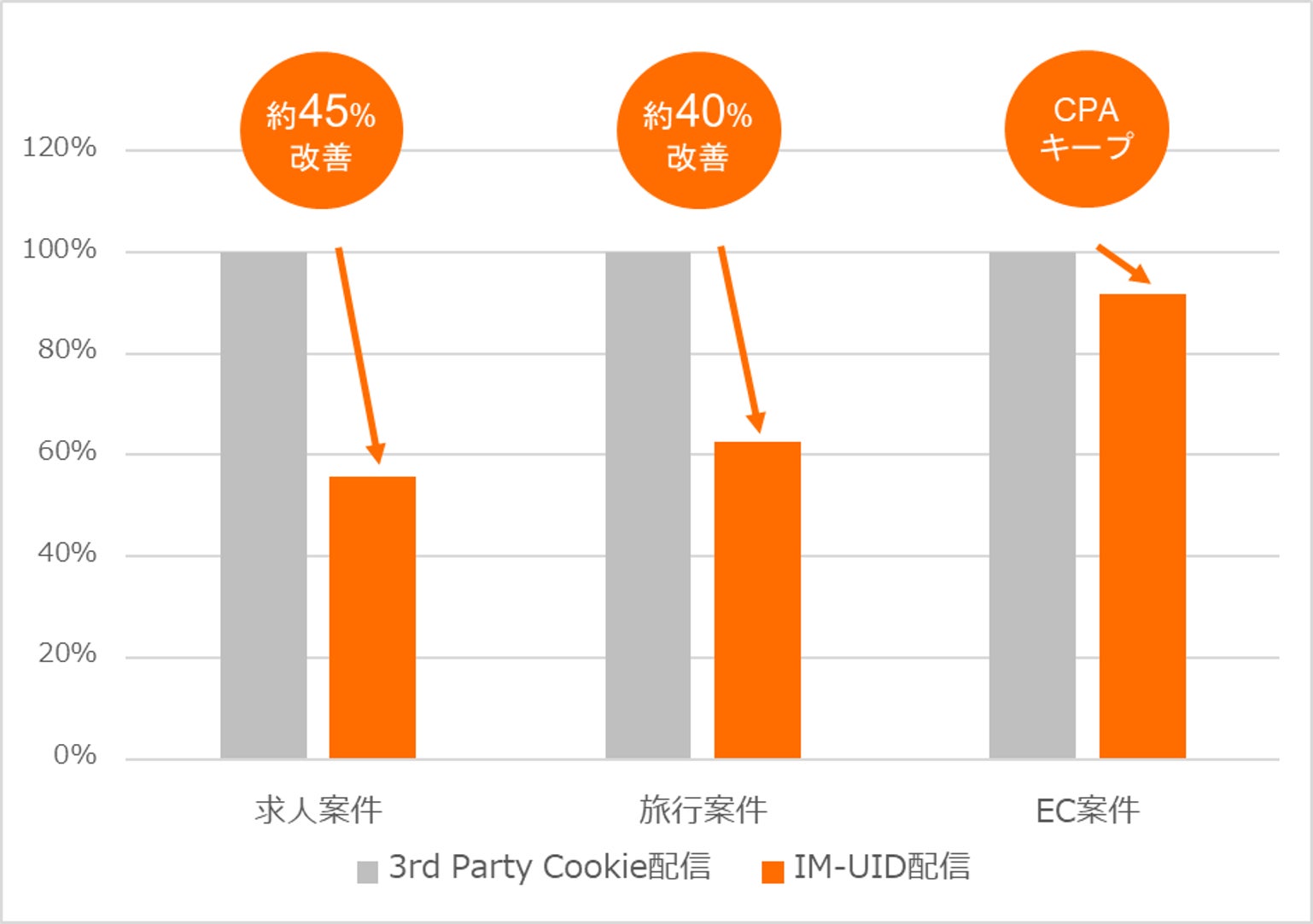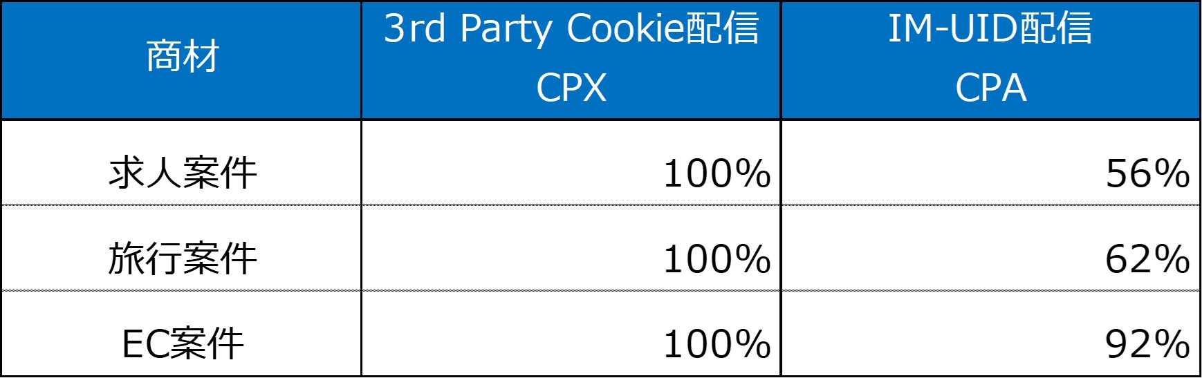 テスト配信では、3rd Party Cookieを用いたダイナミッククリエイティブ配信と「IM-UID」を用いたダイナミッククリエイティブ配信とで広告効果の差異を分析しました。その結果、複数のテスト配信結果において高い広告効果が確認できました。