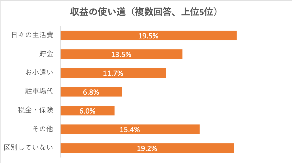 ・収益は「日々の生活費」「貯金」など生活の足しにしている人が多い結果に
