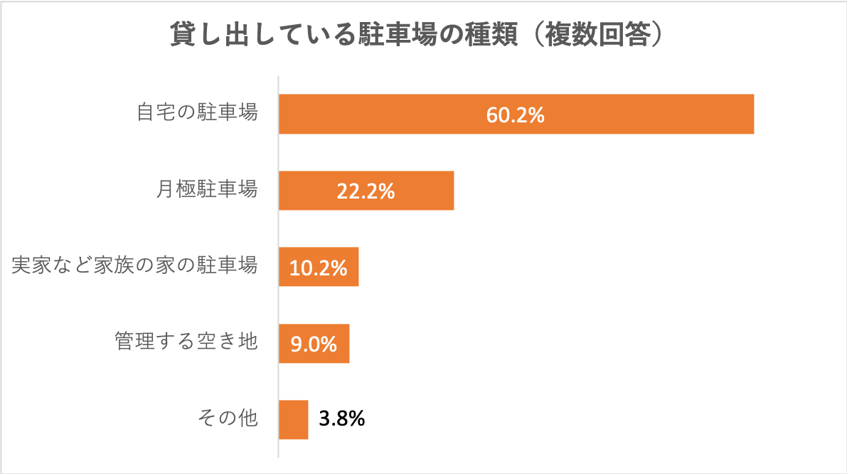 また「実家など家族の家の駐車場(10.2%)」を貸し出す方も多くいることがわかりました。免許返納や子供の独立などライフスタイルの変化により駐車場が空いた際に、貸し出すという選択肢を選んでいただくケースもあるのではないかと推察されます。