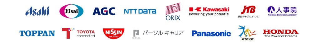 アサヒビール株式会社、エーザイ株式会社、AGC株式会社、株式会社NTTデータ、オリックス株式会社、川崎重工業株式会社、株式会社JTB、人事院、TOPPAN株式会社、トヨタコネクティッド株式会社、日清食品ホールディングス株式会社、パーソルキャリア株式会社、パナソニックグループ、株式会社ベネッセコーポレーション、本田技研工業株式会社 他 ※五十音順