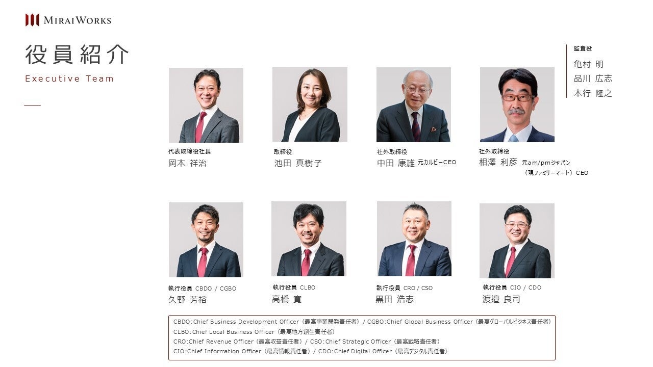 株式会社みらいワークス(本社:東京都港区、代表取締役社長 岡本 祥治、以下「当社」)は、2024年12月23日付にて、am/pmジャパン(現ファミリーマート)社長などを務めた相澤 利彦氏が社外取締役に就任したことをお知らせいたします。相澤氏の社外取締役就任により、経営体制を強化し、プロフェッショナル人材が挑戦するためのエコシステムの創造に向け、事業成長の加速化を図ってまいります。