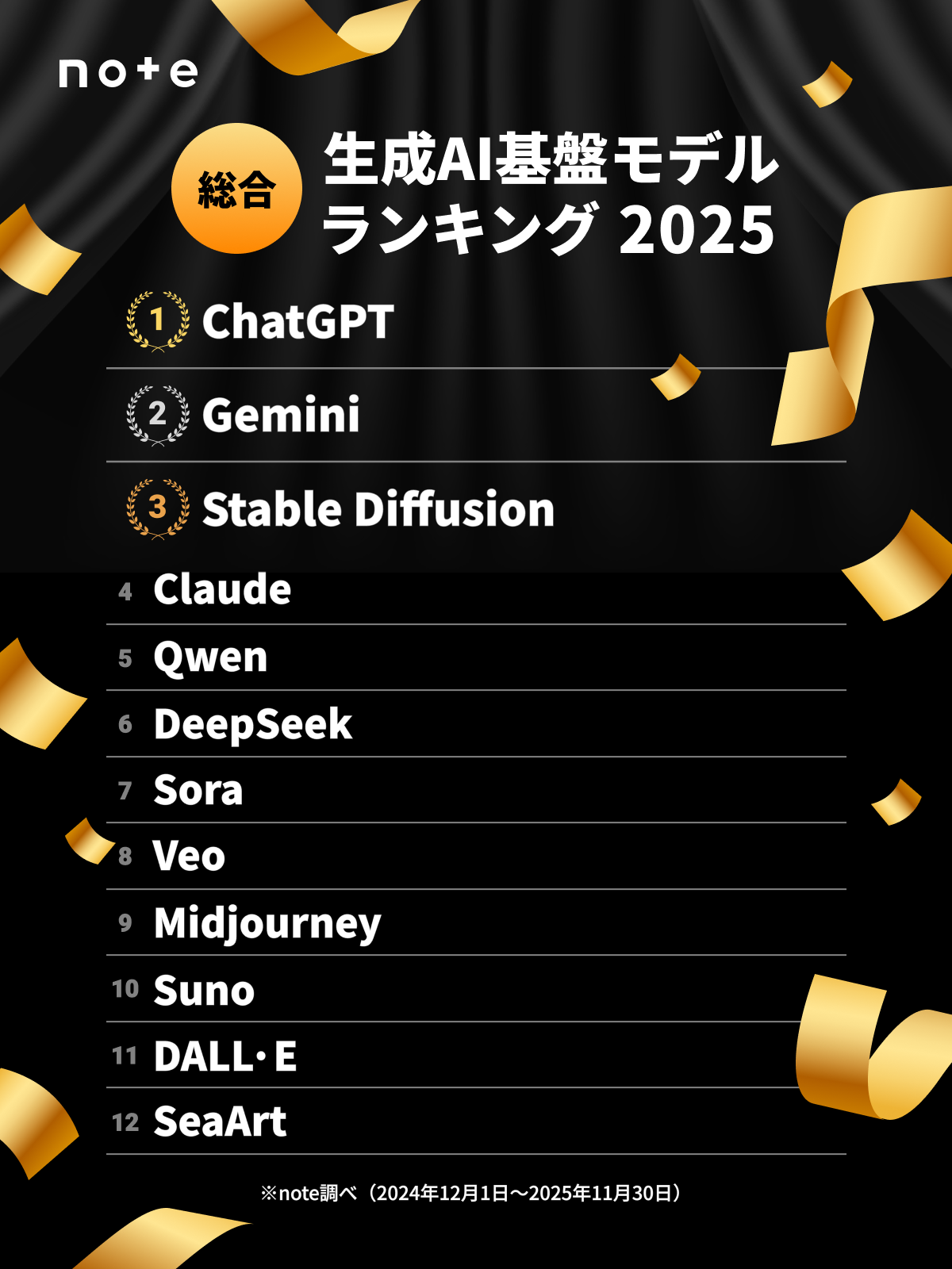 ChatGPTが総合1位、急上昇1位はGemini。noteが「生成AI基盤モデルランキング2025」を発表