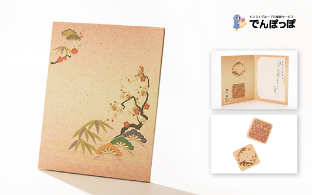 「茶殻電報」はほのかなお茶の香りをまとい、封をあけた瞬間から爽やかな香りをお楽しみいただけます。高級感のある金銀振りの台紙に、縁起の良い松竹梅があしらわれたデザインで、「年賀」や「栄転・昇進・転職」などのビジネスでの節目のご挨拶にはもちろん、「七五三」「結婚」「入学・卒業・就職」のお祝いなど、慶事のさまざまなシーンでご利用いただける商品です。