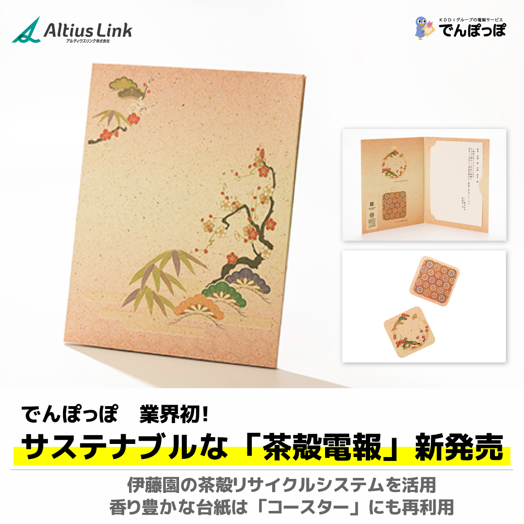 アルティウスリンク株式会社(所在地:東京都渋谷区、代表取締役社長:網野 孝、以下 アルティウスリンク)が提供する、KDDIグループの電報サービス「でんぽっぽ」※1(以下でんぽっぽ)から、株式会社伊藤園の茶殻リサイクルシステムを活用した「茶殻電報」の販売を2024年12月10日(火)より開始します。また、売上の一部を、日本赤十字社の防災・減災をはじめとする活動支援として寄付します。