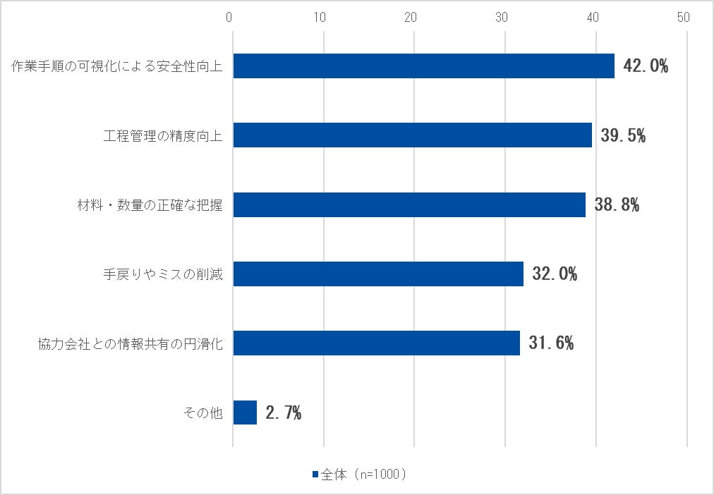 施工BIMの主なメリット(複数回答):1位作業手順の可視化による安全性向上42.0%、2位工程・作業効率41.9%、3位情報共有の円滑化44.0%、4位手戻り・ミスの削減32.0%。[調査③]