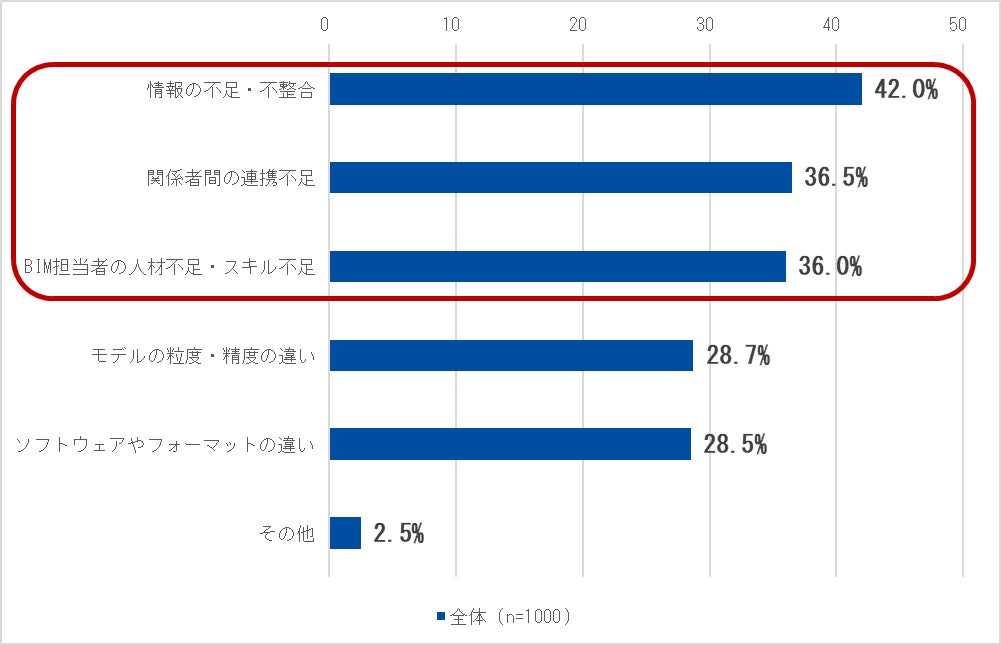設計→施工BIMの連携課題(複数回答):1位情報の不足・不整合42.0%、2位関係者連携不足36.5%、3位人材・スキル不足36.0%、4位モデル精度差28.7%。 [調査③]