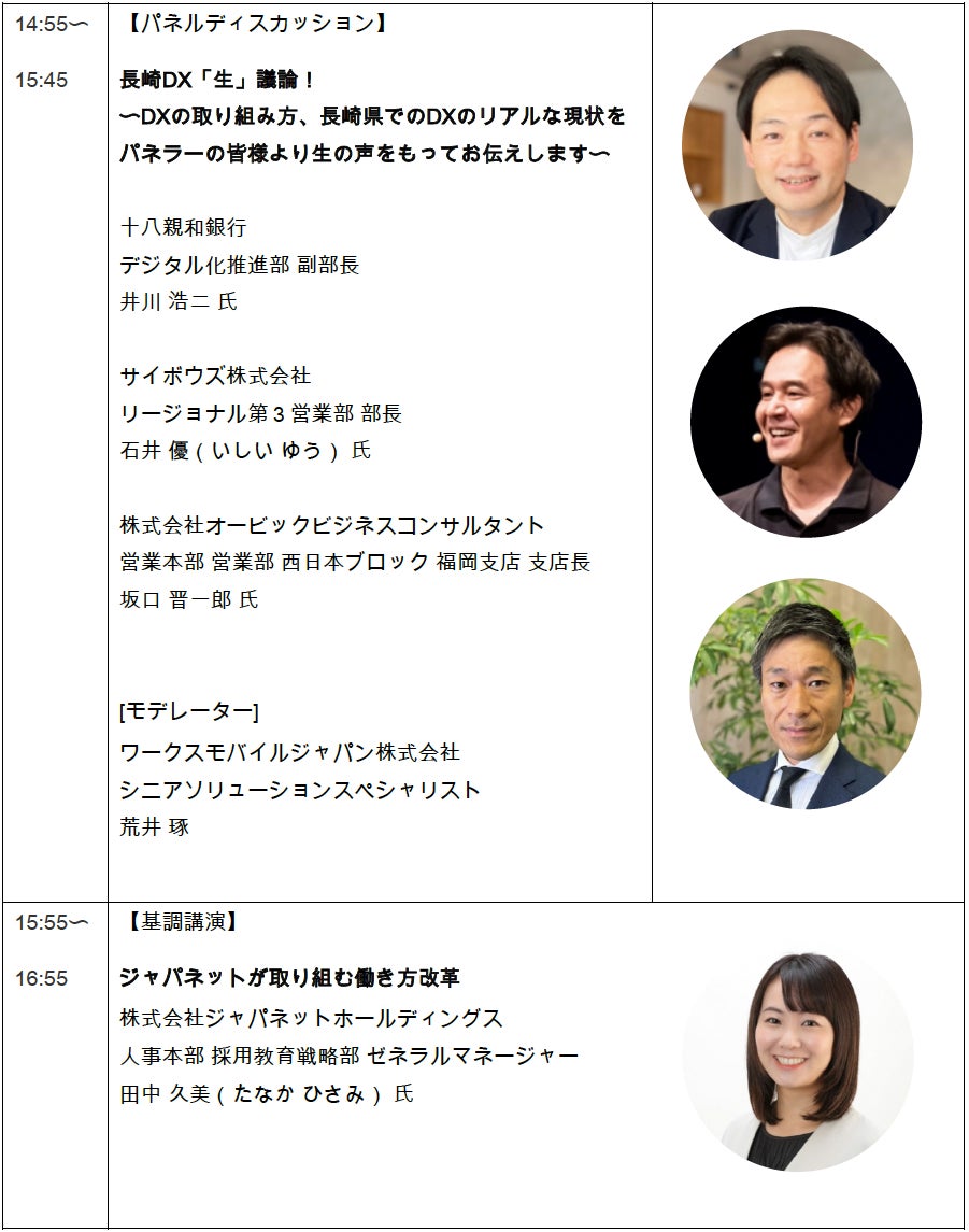 また、基調講演に株式会社ジャパネットホールディングス 人事本部 採用教育戦略部 ゼネラルマネージャー 田中 久美(たなか ひさみ)氏をお招きし、ジャパネットが取り組む働き方改革についてご紹介いただくほか、「LINE WORKS」ユーザーによる導入事例や、長崎県および県内企業のDXについてのパネルディスカッションといった充実したセッションをご用意しております。