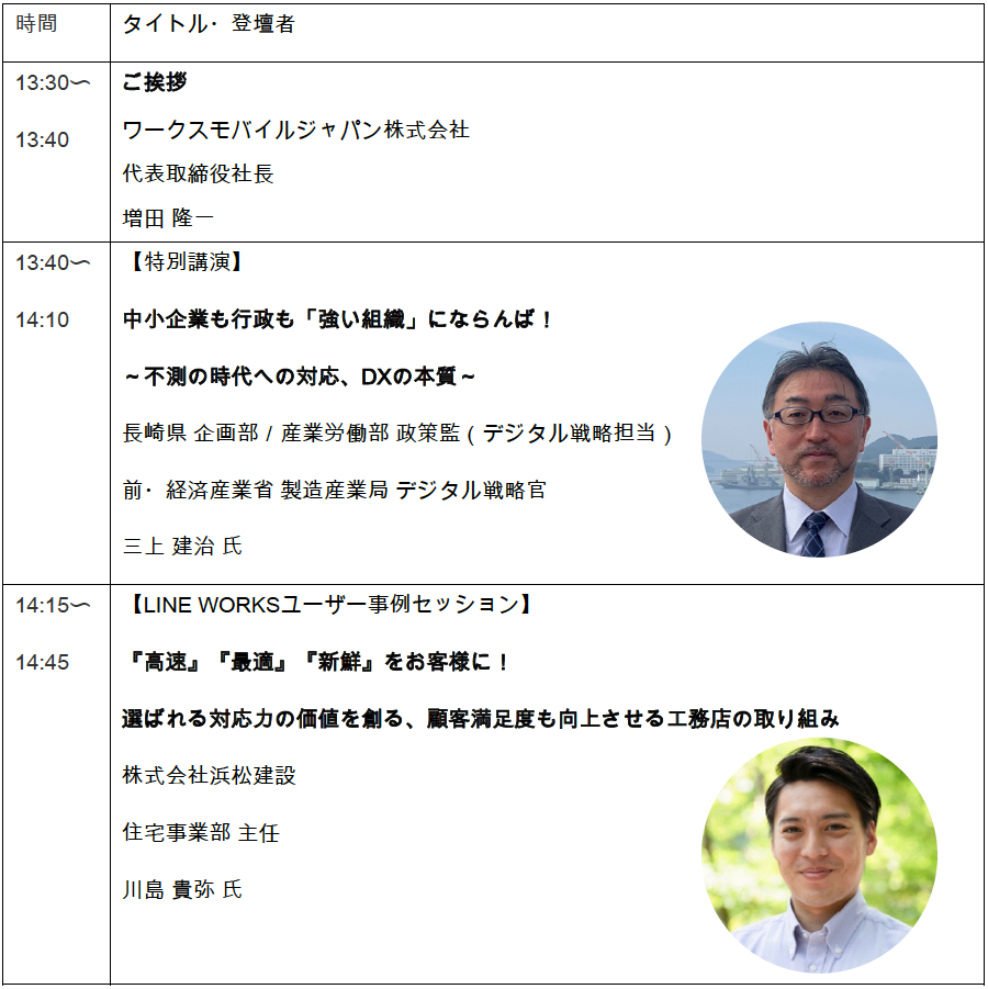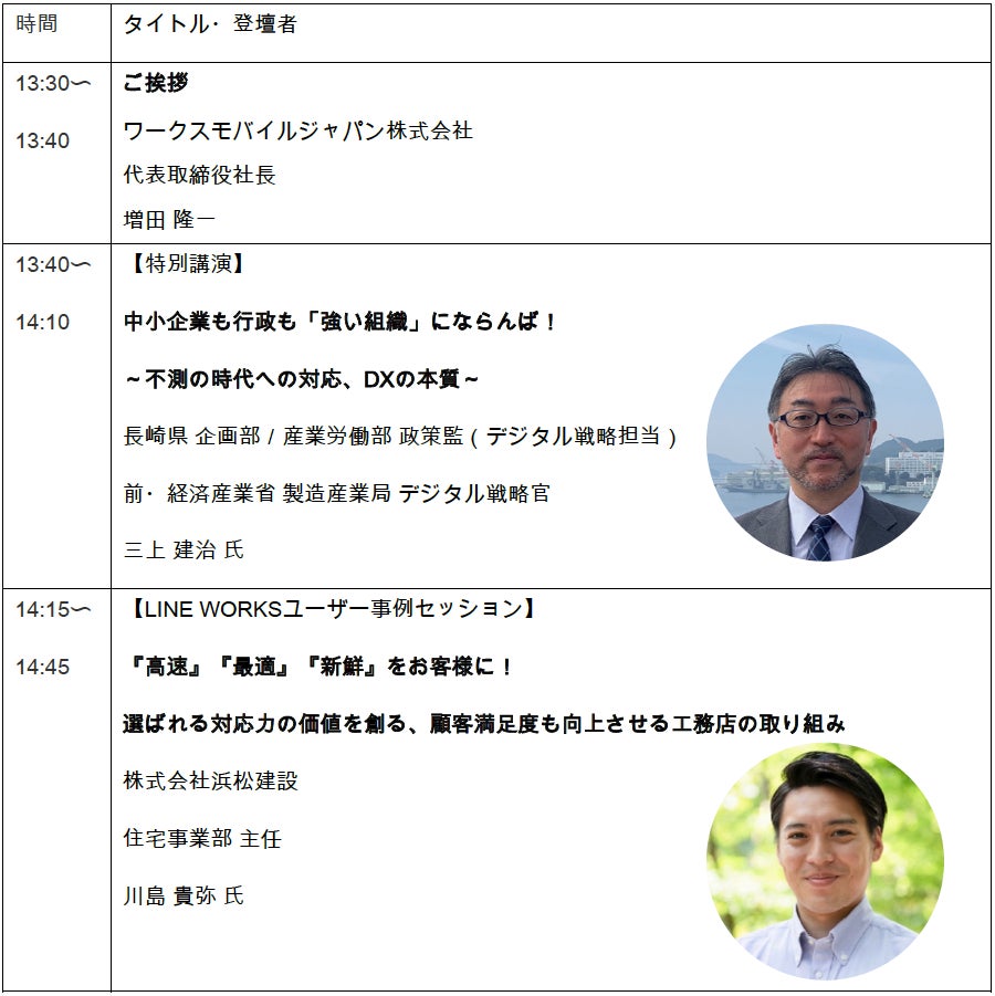 2022年5月、ワークスモバイルジャパンは長崎県企画部と、効率的な行政事務の確立と地域産業のDX推進に向けた連携協定※1を締結いたしました。特別講演では、長崎県 企画部/産業労働部 政策監(デジタル戦略担当)前・経済産業省 製造産業局 デジタル戦略官 三上 建治 氏にご登壇いただき、長崎県が取り組む「行政DX」や、中小企業がDXを進めるべき理由、DXを始める方法について解説していただきます。