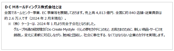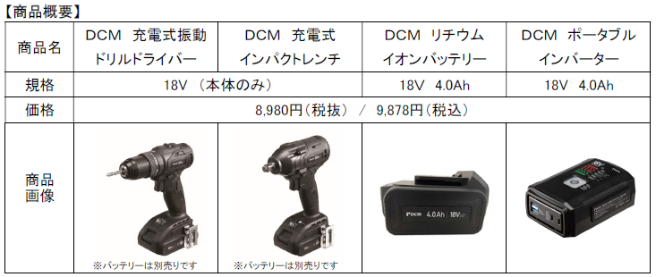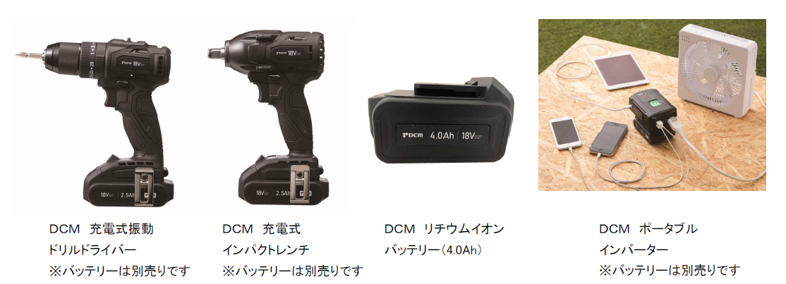全国でホームセンター事業、EC事業を展開するDCMホールディングス株式会社(東京都品川区、代表取締役社長兼COO:石黒靖規、以下「DCM」)は、共通のバッテリーで使用することができる電動工具「DCM 充電式振動ドリルドライバー」「DCM 充電式インパクトレンチ」「DCM リチウムイオンバッテリー」「DCMポータブルインバーター」の4機種を2024年7月5日(金)より全国のDCM・ケーヨーデイツー店舗(一部店舗を除く)にて発売します。