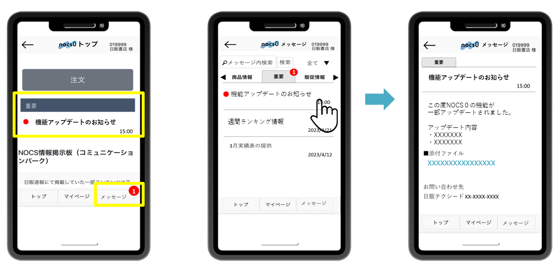 “誰でも・どこでも・無料で”ご利用いただける「NOCS0」から、商品情報や販促情報など、日々の営業に関わる情報を個店別に最適化し、すべての書店様へメッセージ配信いたします。必要な情報が必要な書店様へ発信されることで、情報の抜け漏れ防止や、店頭売上アップ、業務負荷軽減に貢献します。