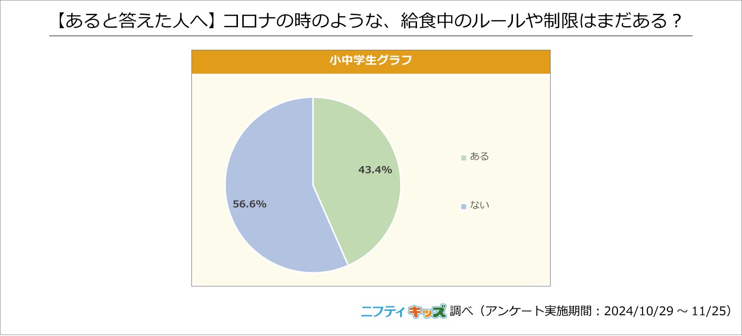 小中学生の43.4%が「コロナの時のような、給食中のルールや制限がまだある」と回答しました。新型コロナウイルス感染症の流行当初に比べると落ち着きはしたものの、元通りとはいかないようです。