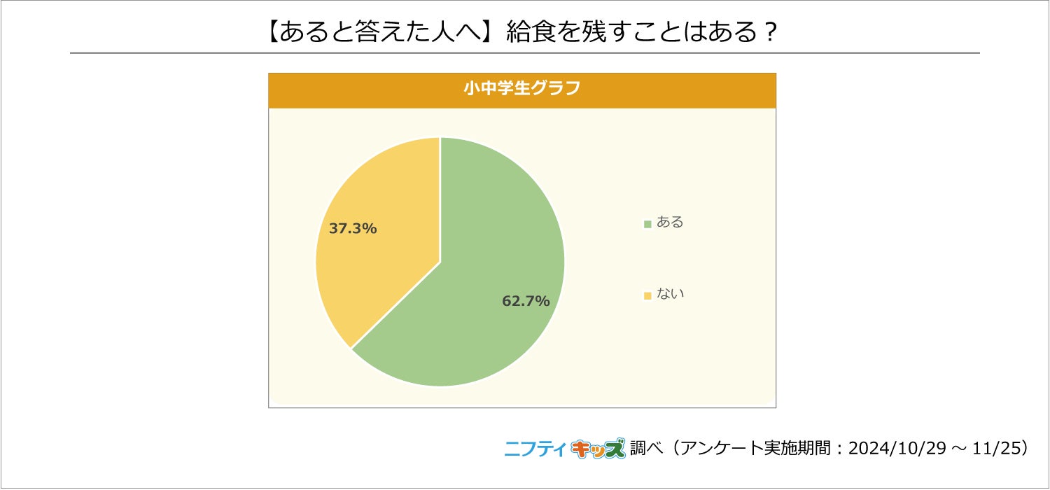 また、「給食を残すことはある?」という設問では小中学生の62.7%が「ある」と答えていて、どこまで食べたら残せるかを聞いたところ、小学生は「一定量食べたら残せる」、中学生は「ルールはなく残せる」が最多でした。中学生になると小学生に比べて、無理のない範囲で給食を楽しむことができる学校が多いようです。