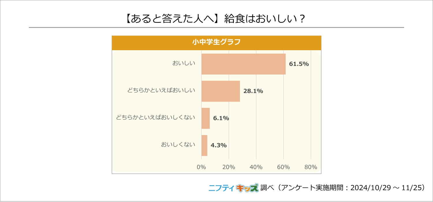 小中学生の61.5%が「おいしい」と回答しました。「どちらかといえばおいしい」の回答と合わせると、約9割の小中学生が給食の味に対して好意的な意見を持っているようです。