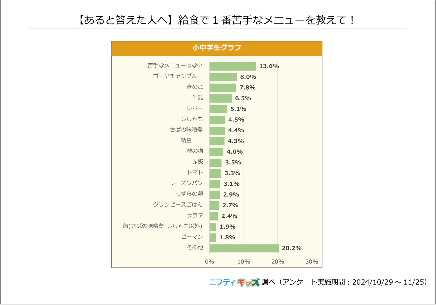 ニフティ株式会社(本社:東京都新宿区、代表取締役社長:前島 一就、以下、当社)は、当社が運営する子ども向けサイト「ニフティキッズ」にて、「給食」に関するアンケート調査を実施し、本日12月26日(木)にレポートを公開しました。