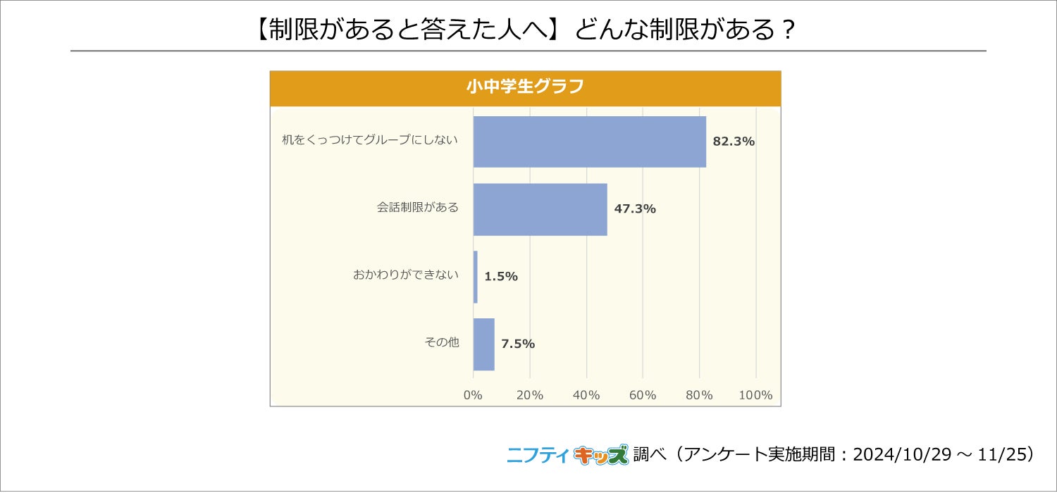 具体的な制限の内容については、「机をくっつけてグループにしない」が82.3%、「会話制限がある」が47.3%でした。飛沫感染の防止には効果的ですが、友達と話しながら食事ができないことでつまらない思いをしている人もいるかもしれません。