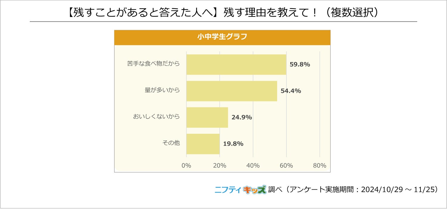 給食を残す理由で最も多かったのは「苦手な食べ物だから」、次いで「量が多いから」でした。