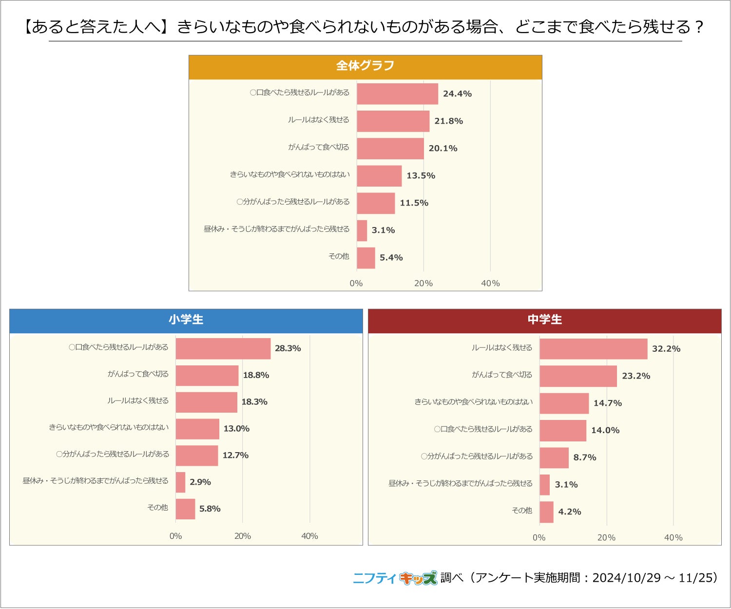 嫌いなものや食べられないものがある場合、最初から残せるのか、少しは食べないと残せないのかといったルールは学校ごとに異なるようです。小学生の回答では「一定量食べたら残せるルールがある」が28.3%と最多でした。一方、中学生は「ルールはなく残せる」が32.2%と、小学生に比べルール化されている学校は少ないのかもしれません。
