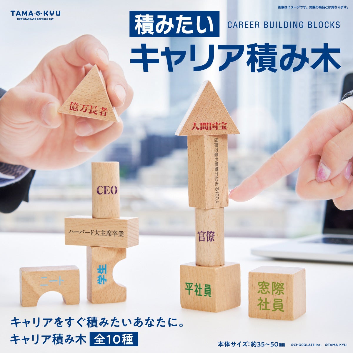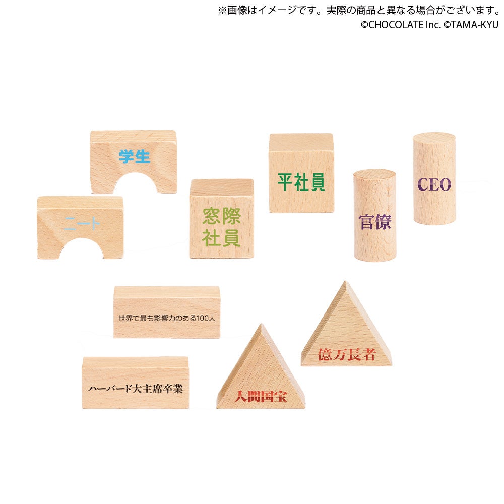 コンテンツスタジオ CHOCOLATE Inc.(本社:東京都渋谷区、代表取締役:渡辺裕介)が企画を手がけたカプセルトイ「積みたいキャリア積み木」が、本日8月24日に株式会社ブシロードクリエイティブ(本社:東京都中野区、代表取締役社⻑:成⽥耕祐)のオリジナルカプセルトイブランド『TAMA-KYU(タマキュー)』より発売され、全国のカプセルトイ自販機にて順次販売が開始されます。本商品は、理想のキャリアを手早く積みたい方に向けたカプセルトイ商品で、多くの方が幼少期に遊んだことのある“積み木”にさまざまなキャリアが印字されています。ラインアップは「ニート」「平社員」から「人間国宝」「億万長者」「世界で最も影響力のある100人」まで、全10種類のキャリアをご用意しています。