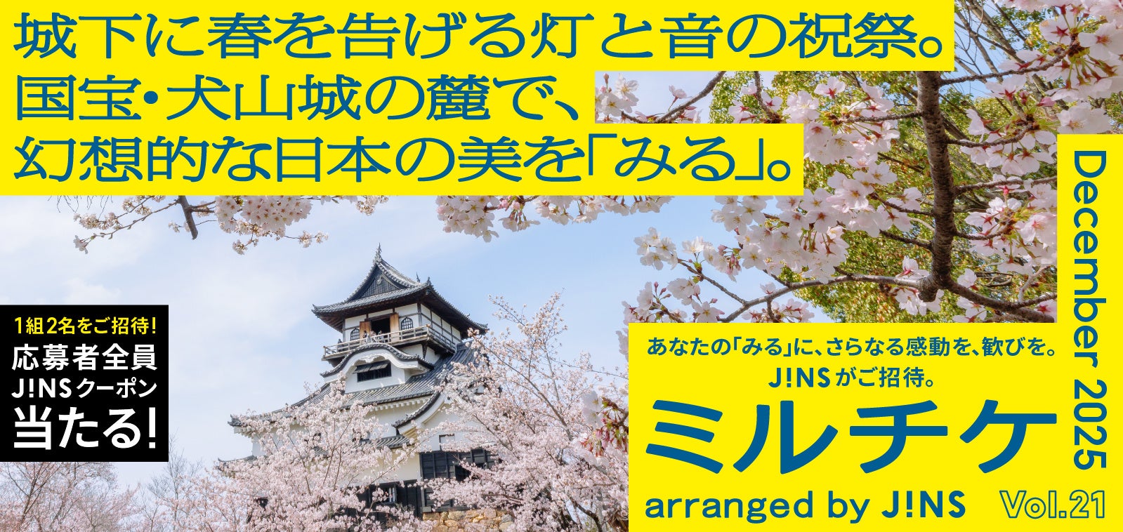 株式会社ジンズ(以下JINS)は、日常では体験できない特別な「みる(見る・観る・視る)」をチケットにして毎月抽選でご招待する「ミルチケ」(https://www.jins.com/jp/campaign/miruticket/)のVol.21として、国宝・犬山城の麓で桜やお祭りなど、幻想的な日本の美を「みる」2泊3日の旅への応募受付を、2025年12月1日(月)より開始いたします。